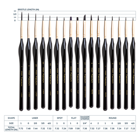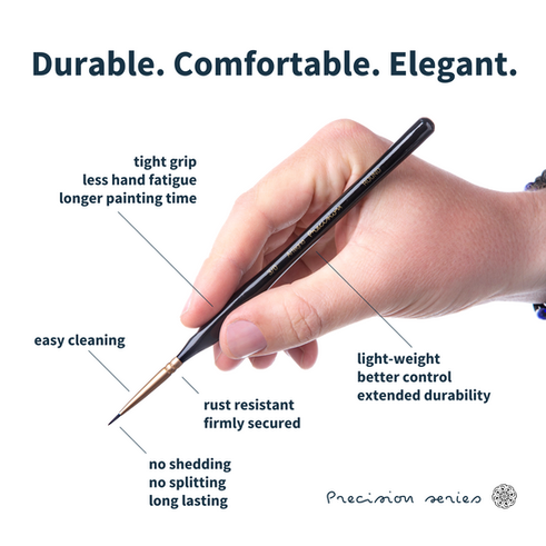 Precision series brushes are ideal for painting miniature figures, scale models (1/35 scale, 1/350 scale, cars, trains, ships, airplanes), dolls, stones, ceramics; nail art and face painting (kids' birthdays, party makeup), cake decorating, cookie painting, shoe- and sneaker painting, brush lettering, illustrations, paint by numbers for adults, army painting, etc.